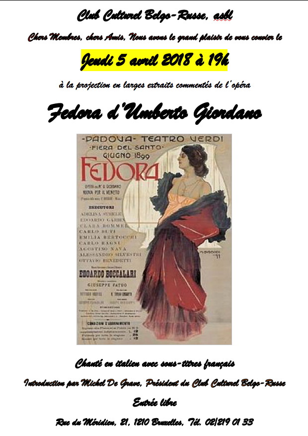 Chanté en italien avec sous-titres français Introduction par Michel De Grave, Président du Club Culturel Belgo-Russe Chers Membres, chers Amis, Nous avons le grand plaisir de vous convier le à la projection en larges extraits commentés de l’opéra Fedora d’Umberto Giordano.