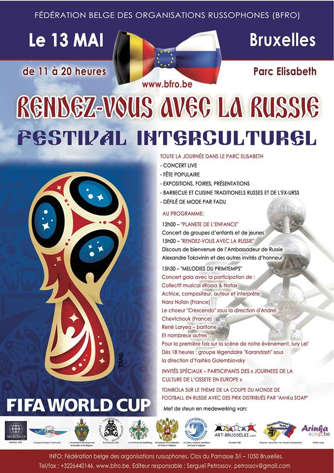 1 => Poësie op muziek als bloesems midden de terreur (Gent) 2-3 => Concert chorale et orchestre - Saison russe (Bougival) 2 => Wandelgangen van het Geheugen (Gent) 2 => SJOOT (Auderghem) 2 => Anton Tchekhov (Bougival) 2 => Vente Art russe (Paris) 2-3 => Экскурсия Прекрасный Париж (Paris) 2 => Вечер/лекция Татьяны Толстой (Bruxelles) 2 => « Спаси и сохрани » (Sossenheim) 3,9-10,17,23 => Table/Atelier langue russe (Nivelles) 3 => Musée « Игрушечная история » (Bruxelles) 4/6 => Barbusse, Merejkovski, Robakidze (Paris) 5 => France, Manifeste écologique et social (Bruxelles) 6 => Movie Sobibor. Собибор (Bruxelles) 6 => Экскурсия Pieter Brueghel (Bruxelles) 7 => Au cœur du Kremlin (Bruxelles) 7 => FPPR - Assemblée générale statutaire (Bruxelles) 7 => Boris Godounov (Hechtel-Eksel) 9 => Бизнес в Бельгии (Ixelles) 9 => Один мужчина и одна женщина (Antwerpen) 10 => Ballet Live 2018 : Coppélia (Kinepolis) 10 => Экскурсия с Владимиром Рониным (Maastricht). 11-17 => Неделя Импульс (Sint-Pieters-Woluwe) 14 => Mondial Russie-Arabie Saoudite (Bruxelles/Namur) 14 => Over Moscou (Schilde) 15 => Death of Stalin (Aalst) 16-17 => Экскурсия Франция (Mont Saint-Michel) 16 => Экскурсия « Рубенс » (Antwerpen) 18 => Voordracht DCV « Rusland » (Harelbeke) 19 => Mondial Egypte-Russie (Saint-Pétersbourg) 19 => Glinka, Rachmaninov, Hypollitov-Ivanov (Bougival) 21 => Concert musique classique (Woluwé-Saint-Pierre) 21 => Over Siberië (Schilde) 21-26 => Конкурс по гамбурскому счёту (Hambourg) 22 => Wij Kleuren Rood Liefde versus Oorlog (Gent) 23 => Закрытие сезона (Sossenheim) 25 => Concert Nikita Gratchev (Mechelen) 25 => Mondial Uruguay-Russie (Iekaterinbourg) 26 => Russian North White Movement & Civil War (Madison) 29-30 => Hermitage Fine Art auction (Monaco)