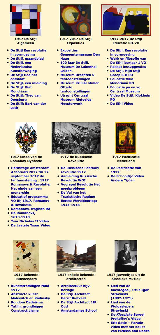 Met o.a.100 jaar De Stijl, bekende kunstenaars, de Russische Revolutie en het einde van de Romanovs. Musea verzorgen hierbij exposities en educatieve activiteiten. 1917 De Stijl - Algemeen De Stijl Een revolutie in vormgeving De Stijl, maandblad De Stijl, een Nederlandse Kunstbeweging De Stijl Hoe het ontstaat De Stijl, een inleiding De Stijl: Piet Mondriaan De Stijl: Theo van Doesburg De Stijl: Bart van der Leck 1917-2017 De Stijl - Exposities Exposities Gemeentemuseum Den Haag 100 jaar De Stijl. Museum De Lakenhal Leiden. Museum Drachten 5 tentoonstellingen Museum Krüller Müller Otterlo tentoonstellingen Utrecht Centraal Museum Rietvelds Meesterwerk 1917-2017 De Stijl - Educatie PO-VO De Stijl: Een revolutie in vormgeving Werk en filosofie van De Stijl leerjaar 1 VO Pakket lessuggesties De Stijl, Mijn Stijl Groep 6-8 PO Educatie Villa Mondriaan PO Educatie po en vo Centraal Museum Video De Stijl. Klokhuis PO De Stijl Video 1917 Einde van de Romanov Dynastie Hermitage Amsterdam 4 februari 2017 tm 17 september 2017 de tentoonstelling : 1917 Romanovs & Revolutie, Het einde van een monarchie Educatief programma VO Bij 1917. Romanov & Revolutie. Romanovs, tragisch lot De Romanovs, 1613-1918. Tsar Nicholas II Video De Laatste Tsaar Video 1917 de Russische Revolutie De Russische Februari revolutie 1917 Aanleiding Russische Revolutie WOI Voorspel Revolutie Het meelprobleem De Val van het Tsaristische Regime Eerste Wereldoorlog: 1914-1918 1917 Pacificatie - Nederland De Pacificatie van 1917 De Schooltijd Video Andere Tijden 1917 Bekende kunstenaars Kunststromingen rond 1917 Abstracte kunst Malewitch en Kadinsky Rondom Dadaisme Tatlin, grondlegger Constructivisme 1917 enkele bekende architecten Architectuur bijv. Berlage De Stijl Architect Gerrit Rietveld De Stijl Architect JJP Oud Amsterdamse School 1917 juweeltjes uit de Klassieke Muziek Lied van de nachtegaal, 1917 Igor Stravinski (1882-1971) Lied van de Wolgaslepers Stravinski De Klassieke Sergej Prokofjev's Video Eric Satie – Parade video met het ballet van Picasso and Dance