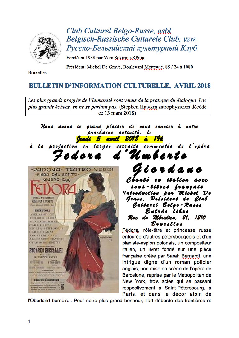 Il a toujours soutenu les projets de notre Club Culturel Belgo-Russe, notamment quand nous avons organisé à Bruxelles la commémoration du tricentenaire du passage de Pierre-le-Grand dans notre capitale. Grand érudit, homme chaleureux, animateur inlassable, il ne laissera à Bruxelles que des amis et que des regrets dans le cœur de tous. Cette projection de l’opéra Fédora sera donc pour nous le moment de le remercier, et nous espérons vous y voir d’autant plus nombreux pour la projection de cet opéra composé dans le style tragique de l’époque, et chanté notamment par Placido Domingo, avec de magnifiques décors et costumes. Notez la date. Nous en parlerons plus longuement dans notre prochain bulletin.