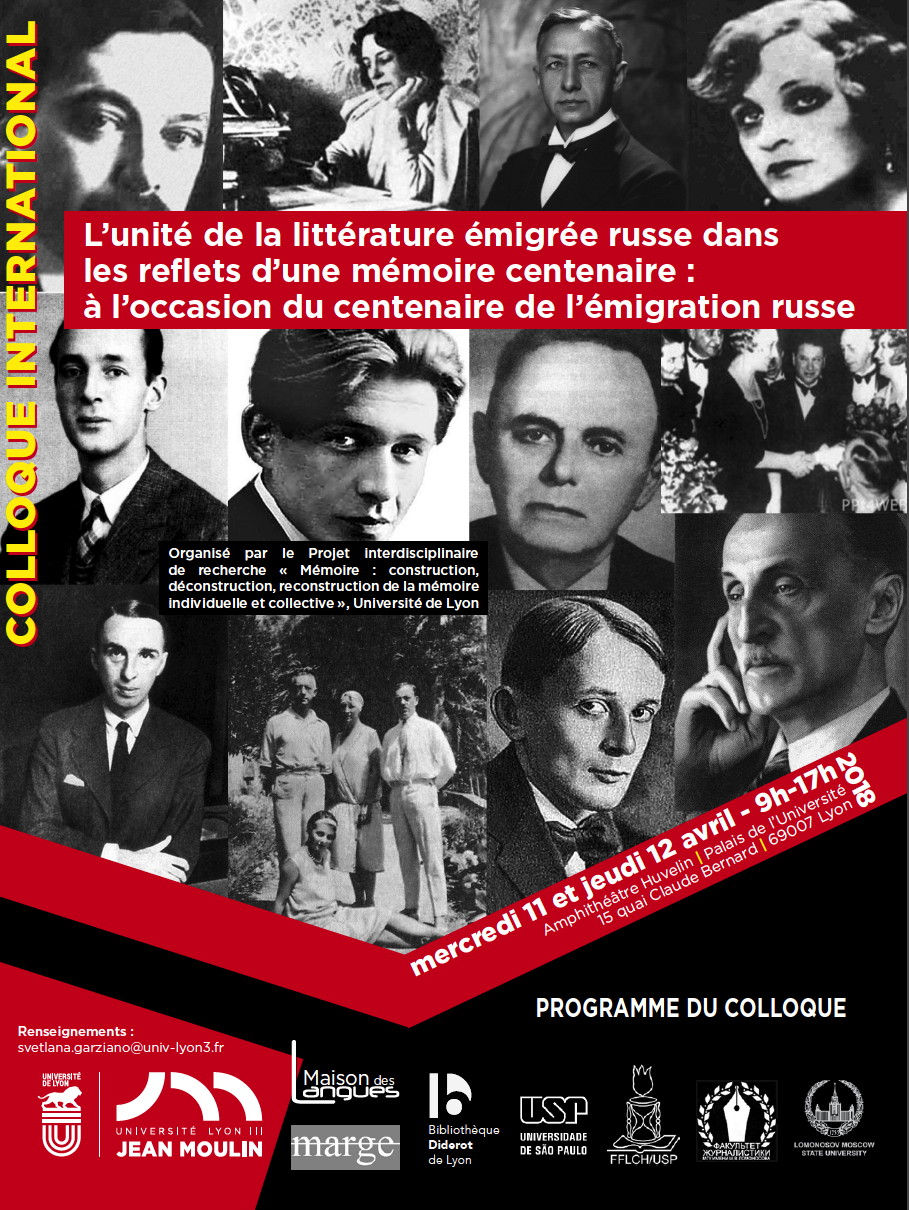 A/ Un Colloque international se déroulera le 11 et 12 avril 2018, « L’unité de la littérature émigrée russe dans les reflets d’une mémoire centenaire : à l’occasion du centenaire de l’émigration russe », organisé par Svetlana Garziano (Université Jean Moulin Lyon 3, MARGE), dans le cadre du Projet interdisciplinaire de recherche « Mémoire : construction, déconstruction, reconstruction de la mémoire individuelle et collective », (Université de Lyon). B/ Exposition d'ouvrages en salle patrimoine du lundi 09 avr 2018 au jeudi 31 mai 2018