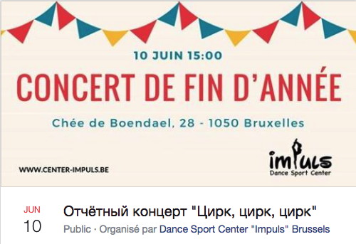 Organisé par Dance Sport Center "Impuls" Brussels Détails Центр ИМПУЛЬС рад пригласить всех своих друзей, учеников и их родителей на отчётный концерт «Цирк, цирк, цирк» На празднике Вас ждёт↘ ✔ яркий танцевальный спектакль с участие детей и взрослых центра "Импульс", а также приглашенных артистов ✔ творческие мастер-классы по созданию шедевров своими руками ✔ аквагрим ✔ фотозона с фотографом ✔ бар
