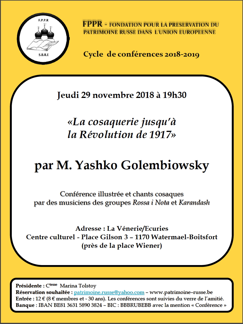 Gratuite pour les membres FPPR 2017 (60 €) mais 12 €+ frais d'envoi pour les non-membres. Siège social : avenue E. Parmentierlaan, 48 - 1150 Bruxelles Présidence : Marina Tolstoy | courriel : patrimoine.russe at yahoo.com | tél. : +32 (0)477 44 42 16 Secrétariat : André Schorochoff | courriel : a.schoro at skynet dot be | tél. : +32 (0)2 384 37 40 Banque : FPPR 310-1446138-51 (IBAN: BE75310144613851 BIC: BBRUBEBB)