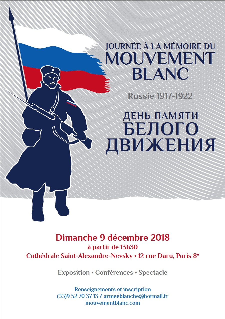 Дорогие друзья, Надеемся, что вы хорошо провели отпуск и готовы вместе с нами участвовать в подготовке организации Дня Памяти Белого движения в воскресенье 9 декабря 2018 года. Для тех, кто недавно присоединился к нам, вы найдёте в Приложении 1 историческое объяснение причин проведения этого Дня, а также программу его проведения. Новости : Мы создали Ассоциацию « 100-летие Белого движения » сроком на один год. В Приложении 3 вы найдете афишу, которая передает образ нашего мероприятия. Плакат завершен и будет доступен в наиболее посещаемых местах (собор, приходы, мэрии 8-го района Парижа и Булони, книжный магазин Les Editeurs Réunis...) со следующей недели. Мэрии 8-го района Парижа и Булони согласились распространять информацию через свои журналы. Наш сайт www.mouvementblanc.com будет действовать с конца сентября. Выставка : Как мы ранее сообщали вам, помимо фотовыставки военных и гражданских лидеров Белого движения, сцен гражданской войны, образов и документов, относящихся к деятельности Российского Красного Креста (старой организации) и эпопеи Галлиполи, мы предлагаем вам выставить фотографии и документы неизвестных истории лиц (как гражданских, так и военных), которые участвовали в Белом Движении, потомками или близкими родственниками, которых вы являетесь и которые вы хотели бы представить общественности. Может быть, это последняя возможность воздать должную память тем мало известным людям, которые во имя свободной России пожертвовали своей молодостью, своим благополучием и зачастую своей жизнью. С этой целью мы организуем встречу во вторник, 25 сентября, в 18:30 в Александро-Невском соборе для желающих принять участие в этой часте выставки, чтобы мы могли вместе согласовать единый стиль (цвета панелей, тип и размер шрифтов...) и, таким образом, придать определенную однородность выставке. Финансирование : Для того, чтобы этот день прошел успешно, мы считаем, что он должен быть организован на лучшем уровне. Сумма предвиденных расходов: аренда палатки, стульев, отопительных приборов, оборудование для конференций (микрофон и громкоговорители, экран, проекторы), непосредственно выставки (фотографии, выставочные стенды, освещение), выступления, реклама ... всё оценивается приблизительно в 10 000 евро. Если вы, также, как и мы, считаете, что это событие является исторически важным и желаете оказать помощь в его реализации, то вы можете сделать это, отправив ваше пожертвование чеком на имя Ассоциации Centenaire du Mouvement Blanc либо переводом на счет (RIB в Приложении 2). Нам позволено выдавать расписку на пожертвования для налоговой инспекции дающая право на снижение налогов. Если у вас есть вопросы, то пишите или звоните нам Елена Бурлакова, Секретарь.