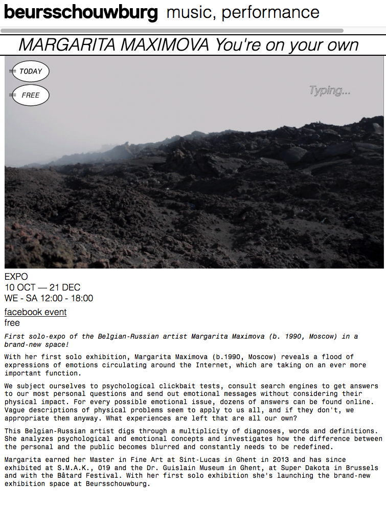 Сайт/Site : https://beursschouwburg.be/en/events/margarita-maximova-youre-on-your-own-and-all-over-the-place/