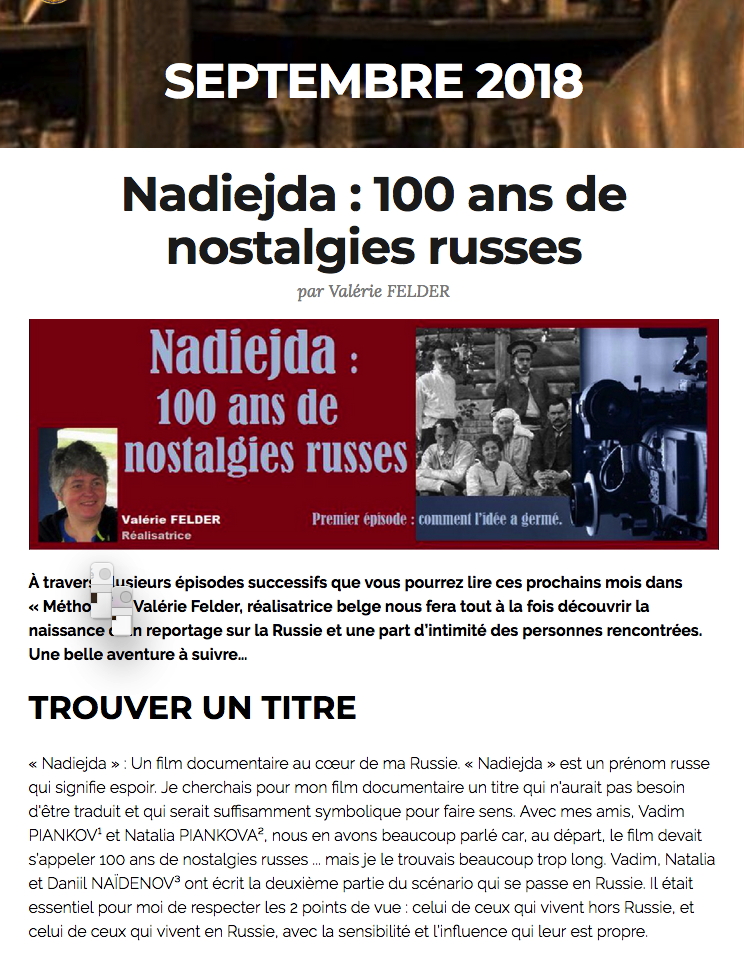 Page internet. Nadiejda - 100 ans de nostalgies russes, par Valérie Felder. 2018-10-01