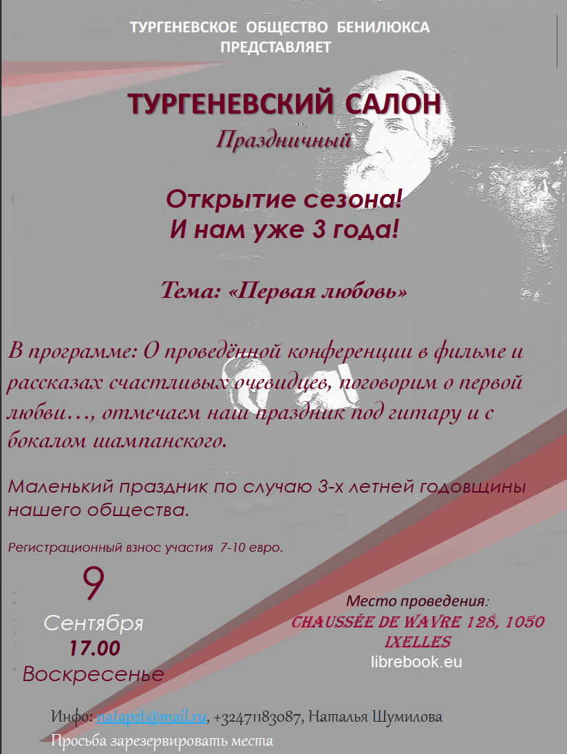 par Michel De Grave Club culturel belgo-russe, asbl | Belgische Russische Cultureel Club, vzw | Русско-Бельгийский културный Клуб Table des matières : Dimanche 19 août 2018 17:00 - Collégiale Saint-Hadelin de Celles - Concert de Musique Arménienne Ancienne Jeudi 9 août 2018 - Concert de Banduras à Mons (Eglise Nd de Messines) Bicenteaire de la Naissance de Tourguéniev Colloque Tourguéniev des 4-8 juillet à Bruxelles et Bougival La Musique Russe par Wivine Rona L’opéra Italien en Russie et les Compositeurs Russes en Italie par Michel De Grave Петраш Е.Г., Военный университет, Библиотека – читальня им. И.С. Тургенева, Вклад И.С. Тургенева в решение проблем авторского Права