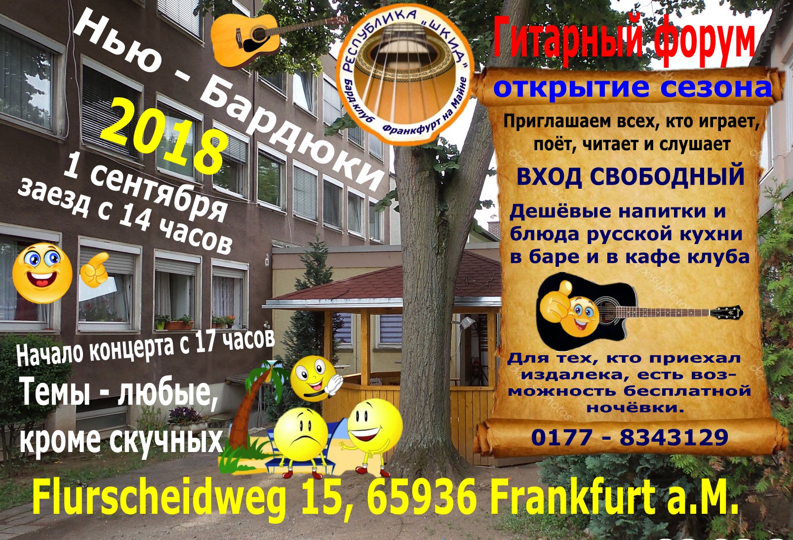 Дорогие друзья! В этом году, 1-го сентября бард-клуб « Республика ШКИД » приглашает всех на открытие сезона. Мы проводим наш ежегодный гитарный форум с учатием авторов и исполнителей из Германии, России и всего Русского Мира. Громко сказано..... Но мы ждём всех желающих и будем рады всем, кто примет участие. Форум открывается с 14 часов. До 17:00 наши гости - исполнители, зрители и слушатели будут иметь возможность разметиться, покушать с дороги, а также попеть и послушать себя и других в рамках « Зелёного микрофона ». Будут установлены две исполнительские площадки: Первая - Сцена во дворе с навесом для выступающих и павильоном для зрителей, которые смогут разместиться на приготовленных скамейках и за столами, где они могут также попить и перекусить. Там же, во дворе имеется беседка и мангал с грилем. Дешёвые напитки и недорогие, но очень вкусные, блюда русской кухни можно будет заказать в баре и кафе клуба. Вторая площадка - сцена в зале кафе, где будет стоять также сответствующая аппаратура и где тоже можно будет не только попеть и послушать, но и попить и покушать. Если будет хорошая погода, (нужно бы позвонить куда следует, договориться) то концерт будем проводить на улице во дворе. Объединённый звук будет вклуючён и в зале. Если таки, погода будет дождь - проводём концерт в зале. После 22:00 - « КТО ВО ЧТО ГОРАЗД ». Время этой части программы не ограничено. ВХОД СВОБОДНЫЙ (выход - тоже) Приносить с собой гитары, песни, стихи и хорошее настроение. БУДЕТ НЕСКУЧНО Приходите, приезжайте, прилетайте!