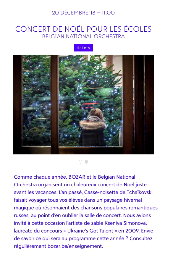 NEXT   ANNONCES Événements du mois de décembre de l'année 2018 [82] : - sans session : - afficher la première notice du mois en Layout Page la notice dont l'IDEvent - le mois est déterminé par le champ firstMonth de la notice - erreur si notice non trouvée dans le vecteur du mois passé par l'URL