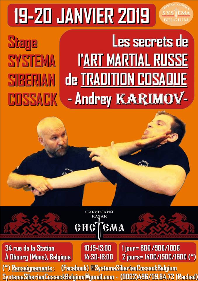 Public · Organisé par Systema Siberian Cossack Belgium et "СИСТЕМА СИБИРСКИЙ КАЗАК - SYSTEMА SIBERIAN COSSACK" en collaboration avec l'ASBL SymphObourg à Obourg. Une opportunité à ne pas manquer pour tous ceux qui veulent s'initier ou se perfectionner à un art martial ancestral de tradition cosaque et rencontrer le fondateur de cet art martial, le grand Maître "Andrey KARIMOV". Nous parcourrons auprès du maître "Andrey KARIMOV" les différents éléments qui composent le style "Systema Siberian Cossack". PROGRAMME DU STAGE : - Sortir d'une ligne d'attaque ("nos jambes nous sauvent!"). - Prendre l'attention et contre-attaquer. - Travailler sur le subconscient de l'adversaire. - Attirer pour mieux prendre le dessus. - Prendre ce qu'on nous donne après avoir éviter l'attaque. - Utiliser les murs, les objets, les meubles comme des éléments amis pour facilement contrôler et soumettre son adversaire. - Travailler avec différentes armes traditionnelles tels que les bâtons, les nagaïkas, les couteaux, les griffes d'ours. - Utiliser les jeux sociaux cosaques pour travailler les réflexes, le timing, la vision périphérique, les peurs, le relâchement. Une traduction du Russe vers le Français et vice-versa sera prévue.