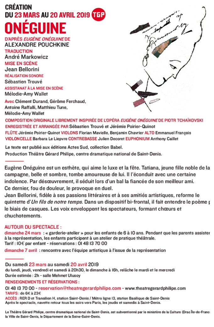 Avec Clément Durand, Gérôme Ferchaud, Antoine Raffalli, Matthieu Tune, Mélodie-Amy Wallet Composition Originale librement inspirée de l'opéra Eugène Onéguine de Piotr Tchaïkovski enregistrée et arrangée par Sébastien Trouvé et Jérémie Poirler-Quinot, flûte : Jérémie Poirier-Quinot violons : Florian Mavielle, Benjamin Chevrier, alto : Emmanuel François, violoncelle : Barbara Le Lierne contrebasse : Julien Decoret, euphonium : Anthony Gaillet. Le texte est publié aux éditions Actes Sud, collection Babel. Production Théâtre Gérard Philipe. centre dramatique national de Saint-Denis.