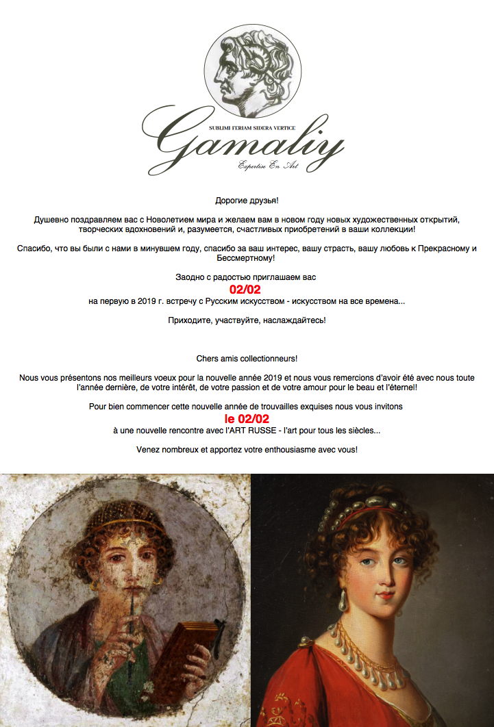 Chers amis collectionneurs! Nous vous présentons nos meilleurs voeux pour la nouvelle année 2019 et nous vous remercions d’avoir été avec nous toute l’année dernière, de votre intérêt, de votre passion et de votre amour pour le beau et l’éternel! Pour bien commencer cette nouvelle année de trouvailles exquises nous vous invitons le 02/02 à une nouvelle rencontre avec l’ART RUSSE - l’art pour tous les siècles... Venez nombreux et apportez votre enthousiasme avec vous!