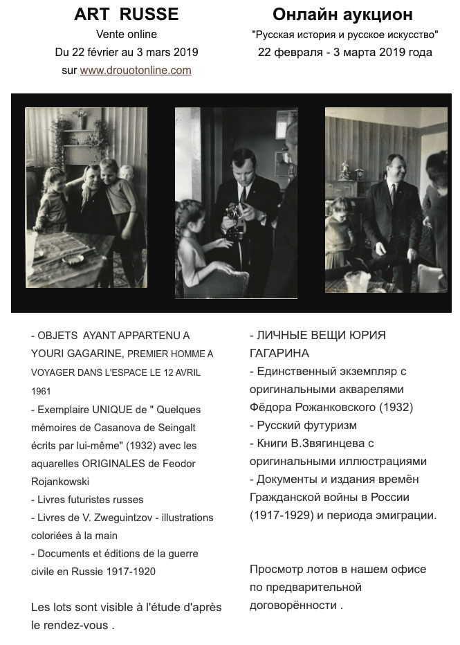 Objets ayant appartenu à Youri Gagarine, premier homme à voyager dans l'espace le 12 avril 1961 ; Exemplaire unique de « Quelques mémoires de Casanova de Seingalt écrits par lui-même » (1932) avec les aquarelles orignales de Feodor Rojankowski ; Livres futuristes russes ; Livres de V. Zweguintzov - illustrations coloriées à la main ; Documents et éditions de la guerre civile en Russie 1917-1920.