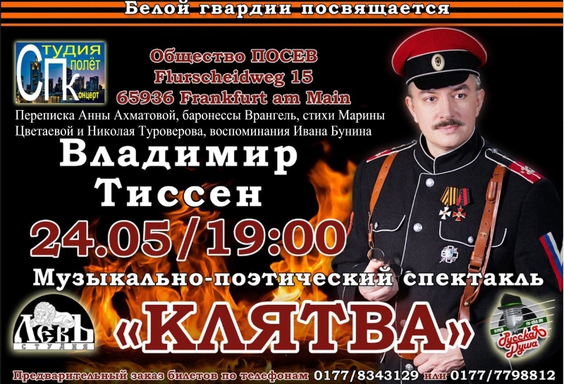 => 19/4 Black Horizon (Charleroi) => 1/6 Une saison russe (Thonon-les-Bains) => 1/6 Les russes Blancs de la Riviera (Saint-Jean de Braye) => 1/7 Exposition Rouge : Art et utopie au pays des Soviets (Paris) 1 => La Pâque Russe (F-75004 Paris) 1 => Communiqué Gallipoli (Paris/Bxl) 2,9,16,23 => Géopolitique Russie (WSL) 2 => 50 ans d'amour conjugal (Watermael) 3 => 2 tickets back (Liège) 4-5 => Excursion Baden-Baden/Strasbourg 5 => Action régiment immortel (Liège) 5,11 => Сказ о Егории Храбром (Leuven/Bxl/Antwerpen) 7-9 => SEAFOOD expo (Bruxelles) 7 => Russia & China - uneasy similarities (Gent) 7 => Кыся (Amstelveen) 8 => Donbas Residents' Response to UK & RU media (Gent) 9,16,21 => Volga éternelle (Saint-Péterbourg/Moscou) 9 => In memoriam (Evere) 10 => Александр Городницкий (Francfort) 10 => Ecrivains russes dans l'émigration (Ixelles) 11,15 => Au fil des fleuves de Russie (Saint-Péterbourg/Moscou) 11 => Golems de Bruno Schulz (Chênée) 11 => Ardennes flamandes (Geraardsbergen/Audenarde) 12 => Rendez-vous avec la Russie (Koekelberg) 15 => Land and Sea Silk Road (Bruxelles) 15 => Platonov (Diest) 15 => Red Haired Men (Brugge) 16 => Connecting Eurasia (Gent) 16-23 => Expo Fragments by Elvis Ways Art (Etterbeek) 16-24 => «Ваши пельмени» (Fürth) 17-26 => Александр Розенбаум tournée 2019 (Allemagne) 18-26 => JDA Travel 2019 (Moscou/Saint-Péterbourg) 19 => Carmen Suite/Petrushka - Bizet/Stravinsky (Kinepolis) 19-29 => Олег Винник (Fürth) 20-21 => CCBLR General Assembly + 3 events (Bruxelles) 22-23 => Test Russian language (Saint-Josse) 22 => Workshop CCBLR export products in Russia and EEU (Bruxelles) 25 => Excursion Hollande folklorique 26 => Живопись : до и после Брейгеля (Bruxelles) Bibliographie : Le régiment immortel. La guerre sacrée de Poutine, Premier Parallèle (Paris) Les anarchistes russes, Nada-éditions (Paris)