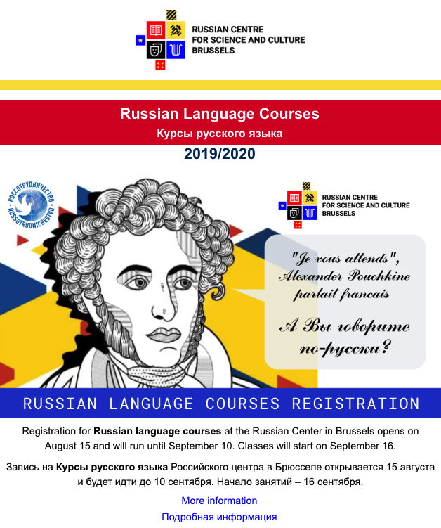 Dear friends! Our language school has an open day! The program includes a tour of the school, which is located in a very interesting house in a very interesting area of Brussels, 2 demonstration classes in Russian, one of which will be conducted by the head of the Russian Centre Vera Bunina, and, of course, the opportunity to enroll in Russian, French and Dutch classes. EN Russian language courses About our courses: We offer you clear, realistic, flexible programs based on your knowledge. You will be able to assimilate Russian quickly and thoroughly, guided by experienced teachers, graduates of Russian universities, and specialized in teaching Russian to foreigners. In addition, all our teachers are native Russian speakers. more about courses FR Langue russe A propos de nos cours: Nous vous proposons des programmes clairs, réalistes, souples et basés sur vos connaissances. Vous pourrez ainsi assimiler le russe rapidement et d'une manière approfondie, guidés par des enseignants expérimentés, diplômés des écoles supérieures de Russie et spécialisés dans l'enseignement du russe aux étrangers. De plus, tous nos professeurs enseignent dans leur langue maternelle.