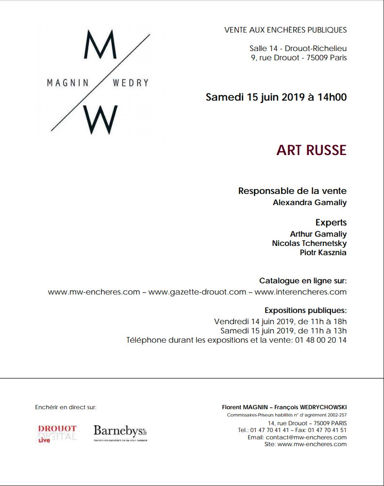 Responsable de la vente : Alexandra Gamaliy Chers amis collectionneurs! Nous somme heureux de vous présenter le catalogue de notre prochaine vente russe qui se déroulera le samedi 15 juin à Drouot. Experts : Arthur Gamaliy, Nicolas Tchernetsky, Piotr Kaznia. Эту изысканную гравюру Лори, происходящую из одного замечательного парижского собрания, мы имели честь недавно представлять в нашем каталоге. Гравюра не без отчаянной борьбы была приобретена на аукционе для просвещенного коллекционера из Санкт-Петербурга. Ныне она украшает его собрание - в чем некоторые из вас могли убедиться, посетив выставку «Трех коллекций» в Русском музее. Обращаем ваше внимание, что завтра на аукционе Magnin Wedry в Париже мы представим один замечательный портрет, также происходящий из важного парижского собрания... Не упустите для себя возможность пополнить свою коллекцию вещью музейного уровня! Nous somme heureux de vous annoncer qu’une vue magnifique du chateau St Michel provenant d’une collection particuliere tres distinguee avait ete vendue a une vente a nous et fait actuellement patie d’une prestigieuse collection saint-petersbourgeoise, exposee récemment au Musee Russe. Vous avez la chance d’acquerir des objets semblables a notre vente russe avec MW qui se déroulera demain le samedi 15 juin à Drouot.
