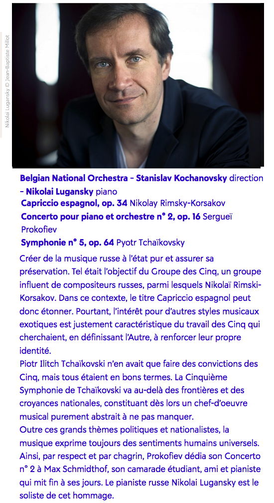 Conductor : Stanislav Kochanovsky in Brussels with Belgian National Orchestra The Mighty Handful, a group of five prominent Russian composers, including Nikolaï Rimsky-Korsakov, set out to create and preserve pure Russian music. So you can see how a title such as Capriccio Espagnol would be unexpected in this context. And yet, the interest in exotic, different music styles is typical of the Five – defining the Other to strengthen one’s own identity. Pyotr Ilyich Tchaikovsky did not endorse the convictions of the Five, even though they all remained friendly with each other’s. Tchaikovsky’s Fifth Symphony is not interested in national boundaries and beliefs, but is a purely abstract musical masterpiece that should not be missed. Music is inspired by huge political and nationalist themes, but also by universal human emotions. Out of respect and sorrow Prokofiev dedicated his Concerto No. 2 to fellow student, friend and pianist Max Schmidthof, who committed suicide. The Russian pianist Nikolai Lugansky is the soloist in this tribute.