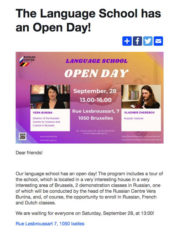Dear friends! Our language school has an open day! The program includes a tour of the school, which is located in a very interesting house in a very interesting area of Brussels, 2 demonstration classes in Russian, one of which will be conducted by the head of the Russian Centre Vera Bunina, and, of course, the opportunity to enroll in Russian, French and Dutch classes. EN Russian language courses About our courses: We offer you clear, realistic, flexible programs based on your knowledge. You will be able to assimilate Russian quickly and thoroughly, guided by experienced teachers, graduates of Russian universities, and specialized in teaching Russian to foreigners. In addition, all our teachers are native Russian speakers. more about courses FR Langue russe A propos de nos cours: Nous vous proposons des programmes clairs, réalistes, souples et basés sur vos connaissances. Vous pourrez ainsi assimiler le russe rapidement et d'une manière approfondie, guidés par des enseignants expérimentés, diplômés des écoles supérieures de Russie et spécialisés dans l'enseignement du russe aux étrangers. De plus, tous nos professeurs enseignent dans leur langue maternelle.