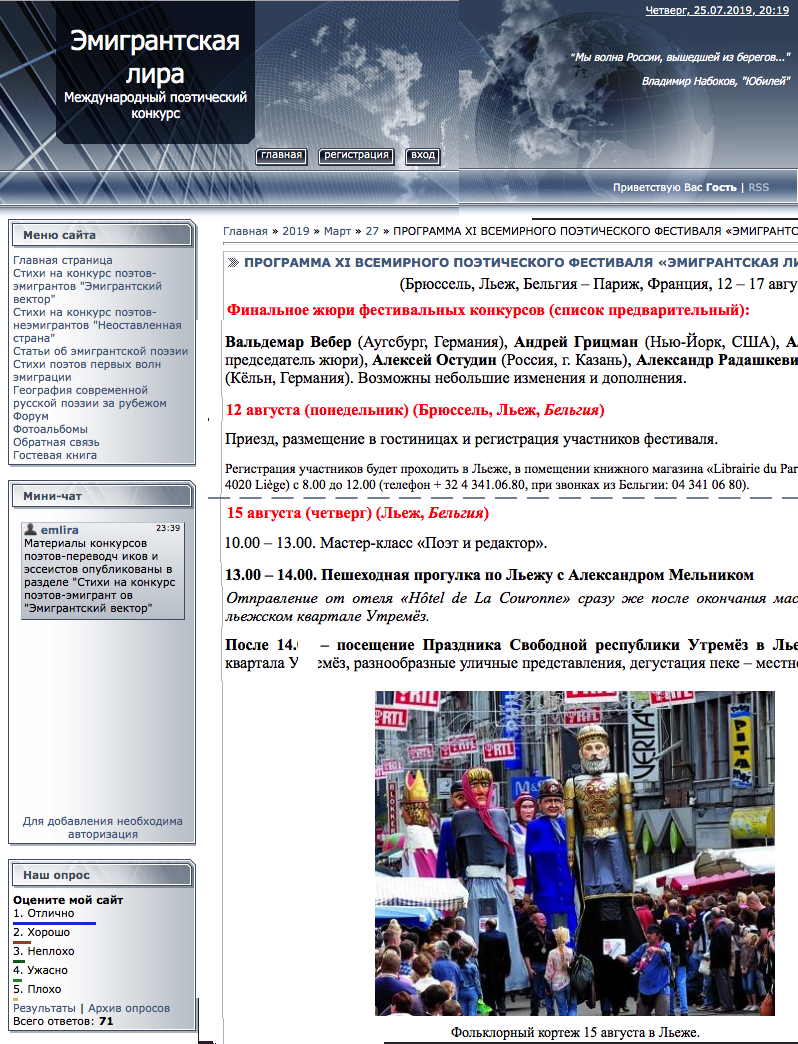 http://bel.rs.gov.ru/ru/announcements/22790 https://emlira.ucoz.com/news/programma_xi_vsemirnogo_poehticheskogo_festivalja_ehmigrantskaja_lira_2019_nachalo/2019-03-27-293 http://emlira.ucoz.com/news/programma_xi_vsemirnogo_poehticheskogo_festivalja_ehmigrantskaja_lira_2019_okonchanie/2019-03-27-292