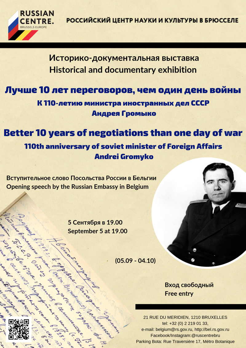 Exhibition dedicated to Andrei Gromyko opens in the Russian centre Dear friends, We draw your attention to a documentary exhibition on the life and activities of prominent Soviet diplomat and statesman Andrei Gromyko in honor of his 110th birthday. Andrei Gromyko is famous for his unsurpassed diplomatic mastery, his skillful advancement of our country’s interests, and his participation in the key meetings and events of the 20th century. He was present at the founding of the UN, and in 1946 became the first Soviet representative to the organization. For almost three decades, from 1957 to 1985, Andrei Gromyko led the Ministry of Foreign Affairs, becoming a living symbol of Soviet foreign affairs in those years. Thanks to his active work, dozens of bilateral and multilateral agreements were reached. The exhibition has united a number of archival documents and photo materials, allowing us to make visual acquaintance with the great diplomatic heritage of Andrei Gromyko, evaluate the scale and diverse characteristics of his personality and his contribution to the development of international relations. The exhibition was prepared with the Russian Embassy in Belgium.