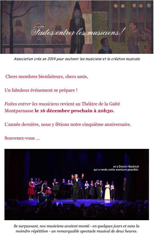 Diffusion de décembre 2019. Calendrier d'événements à caractère culturel russe.Calendrier d'événements à caractère culturel russe. Décembre 2019. Lien pour visualiser ce courriel dans votre navigateur : Mail/RC_Mailing_December_01,_2019.html | Calendrier vava.be décembre 2019 | Liste des intitulés | Album des affiches/illustrations | Descriptifs détaillés | Nouvelles affiches | Diaporama 1 → 100 ans culture russe (Bruxelles) 3,11 → Médias de grand chemin (Ixelles) 3 → Promenade en Carélie (Paris) 4,7-8, 12-14 → Casse noisette (Bruxelles/LLN/Oostende/Antwerpen) 5-6 → Lac des Cygnes (Bruxelles) → 6 Research Fellowships (London) 6 → Jahrezeiten Rachmaninow/Scriabin (Bad Homburg) 6 → Concert Noël Dzvinha (Forrières) 7 → Вечер песен и стихов (Sossenheim) 7,28 → Гастротур (Gent) 7-8 → Неоконченный роман (Antwerpen/Den Haag) 7 → Belfius art collection (Bruxelles) → 8 Anatevka (Antwerpen/Gent) 8 → Дело о средневековом убийстве (Bruxelles) 11,25,29/12-1/1 → Chœur d'hommes Alexandre Nevsky (Guebwiller/Paris) 11→ Russia cultural powerhouse (Woluwé-Saint-Lambert) 13,15,17-18 → Choeurs Armée Russe (Huy/Namur/Frameries/Mouscron/Ath) 13 → Ma Russie (Watermael) 14 → Christmas Concert (Bruxelles) 14-15 → Chantres Orthodoxes Russes (Roscoff/Crozon)