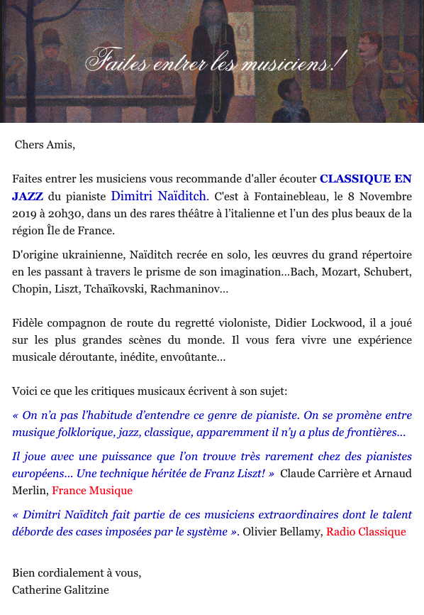 Bonjour, Je m'appelle Steven Drévillon, je suis membre de la troupe AMRI Théâtre. Comme convenue par téléphone, je vous contacte pour vous demander, si possible, de nous aider à communiquer autour de la pièce de théâtre slave que nous jouerons les prochains mois à Paris. La pièce en question est une comédie administrative, absurde, écrite par Valentin Kataïev (1947). Usurpation d'identité pour de la peinture blanche. Et après ça on dit que les fonctionnaires n'aiment pas les histoires. Pour faire signer un bon de commande, en temps et en heure, au camarade Mioussov, Zaïtsev est obligé de mentir sur son identité. C'est pour lui le début des ennuis. Résumé : Zaïtsev, un homme sain d'esprit et de bonne volonté, arrive à la maison de repos "Les Tournesols" et veut voir Mioussov pour une signature. Rien de plus simple au prime abord. Celui-ci, honorable fonctionnaire et habitué des lieux, devrait se reposer tranquillement dans sa chambre selon sa routine dominicale. Malheureusement, rien ne se passe comme prévu. Victime de la complexité administrative, Zaïtsev est obligé de mentir pour entrer dans l'établissement. Il n'imagine pas alors qu'il vient de mettre le pied dans un engrenage de quiproquos dont il ne sortira pas indemne. Pour ne rien arranger, cette manie de vouloir voir Mioussov se propage comme un virus dans la clinique, et celui-ci, terrorisé, se cache d'autant plus. La pelote de laine s'emmêle, les situations ubuesques s'enchaînent et la folie fait gentiment son nid dans la tête de nos personnages. Auteur : Valentin Kataïev Artistes : Céline Lesage, Gilles Rouillet, Maï Sarlabous, Maryanne Kovacs, Pascale Aoudé, Steven Drévillon, Thomas Meurgey, Yann Amri Metteur en scène : Céline Lesage & Steven Drévillon