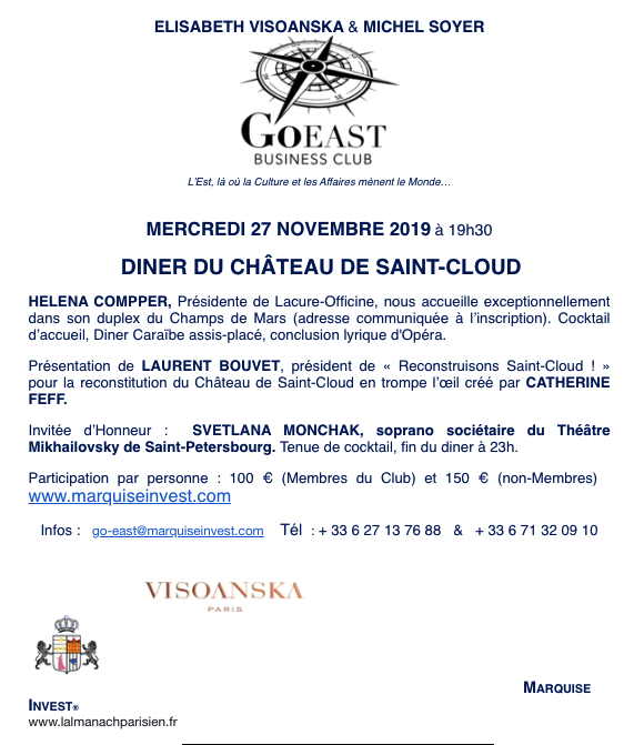 GoEast Business Club Elisabeth Visoanska & Michel Soyer L’Est, là où la Culture et les Affaires mènent le Monde… Helena Compper, Présidente de Lacure-Officine, nous accueille exceptionnellement dans son duplex du Champs de Mars (adresse communiquée à l’inscription). Cocktail d’accueil, Dîner Caraïbe assis-placé, conclusion lyrique d'Opéra. Présentation de Laurent Bouvet, président de « Reconstruisons Saint-Cloud ! » pour la reconstitution du Château de Saint-Cloud en trompe l’œil créé par Catherine Feff. Invitée d’Honneur : Svetlana Monchak, soprano sociétaire du Théâtre Mikhailovsky de Saint-Petersbourg. Tenue de cocktail, fin du diner à 23h.