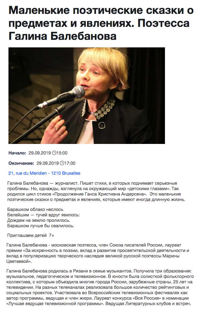 Сайт/Site : https://www.ruscentre.be/events/malenkie-poeticheskie-skazki-o-predmetah-i-javlenijah-poetessa-galina-balebanova.html