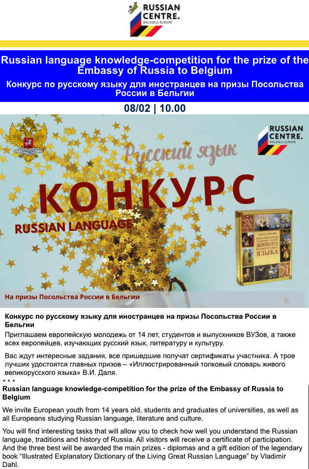 Diffusion de février 2020. Calendrier d'événements à caractère culturel russe.Calendrier d'événements à caractère culturel russe Février 2020 Lien pour visualiser ce courriel dans votre navigateur Mail/RC_Mailing_February_01,_2020.html | Calendrier vava.be février 2019 | Liste des intitulés | Album des affiches/illustrations | Descriptifs détaillés | Nouvelles affiches | Diaporama → 1/2 Ma Vie d'enfant (Bruxelles) 1/2 → Diffusion-courriel Agenda culture russe (Gilly) 1/2 → Гастротур : пиво и не только (Antwerpen) 2/2 → Boekenfeest (WSL) 2/2 → Охотники за древностями (Bruxelles) 2/2 → Разум и чувства (Bruxelles) → 3/2 Pêle-mêle de Noël (Saint-Josse) 4/2 → Soirée Essénine (Paris) 5-25/2 → К 250-летию Ивана Крылова (Saint-Josse) 6/2-21/3 → Expo Boris Mestchersky (Liège) 6/2 → Guerre et paix (Nancy) 7/2 → Pratique du russe parlé (Ixelles) 8-9/2 → Espace russophone : immensité et diversité (Paris) 8/2 → La belle au bois dormant (Liège) 8/2 → Брейгель в черно-белом (Bruxelles) 8/2 → Семинар « Златоуст » (Saint-Josse) 8/2 → Competition Russian language (Saint-Josse) → 9/2 Pressentiment de Cosmos (Paris) 9/2 → Путешествие в Средние века (Bruxelles) 11/2 → La peinture en Russie au XIXe (Saint-Josse) 13-15/2 → Brussels Philharmonic & Boris Giltburg (Ixelles) 13/2 → Cinéma club « Бег » (Saint-Josse) → 15/2 La Russie au siècle des Lumières (Seneffe) 15/2 → Alexander Melnikov, piano (Ixelles)