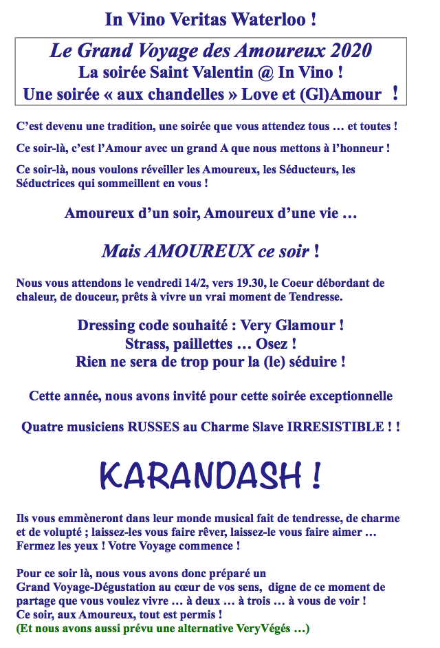 Diffusion de février 2020. Calendrier d'événements à caractère culturel russe.Calendrier d'événements à caractère culturel russe Février 2020 Lien pour visualiser ce courriel dans votre navigateur Mail/RC_Mailing_February_01,_2020.html | Calendrier vava.be février 2019 | Liste des intitulés | Album des affiches/illustrations | Descriptifs détaillés | Nouvelles affiches | Diaporama → 1/2 Ma Vie d'enfant (Bruxelles) 1/2 → Diffusion-courriel Agenda culture russe (Gilly) 1/2 → Гастротур : пиво и не только (Antwerpen) 2/2 → Boekenfeest (WSL) 2/2 → Охотники за древностями (Bruxelles) 2/2 → Разум и чувства (Bruxelles) → 3/2 Pêle-mêle de Noël (Saint-Josse) 4/2 → Soirée Essénine (Paris) 5-25/2 → К 250-летию Ивана Крылова (Saint-Josse) 6/2-21/3 → Expo Boris Mestchersky (Liège) 6/2 → Guerre et paix (Nancy) 7/2 → Pratique du russe parlé (Ixelles) 8-9/2 → Espace russophone : immensité et diversité (Paris) 8/2 → La belle au bois dormant (Liège) 8/2 → Брейгель в черно-белом (Bruxelles) 8/2 → Семинар « Златоуст » (Saint-Josse) 8/2 → Competition Russian language (Saint-Josse) → 9/2 Pressentiment de Cosmos (Paris) 9/2 → Путешествие в Средние века (Bruxelles) 11/2 → La peinture en Russie au XIXe (Saint-Josse) 13-15/2 → Brussels Philharmonic & Boris Giltburg (Ixelles) 13/2 → Cinéma club « Бег » (Saint-Josse) → 15/2 La Russie au siècle des Lumières (Seneffe) 15/2 → Alexander Melnikov, piano (Ixelles)