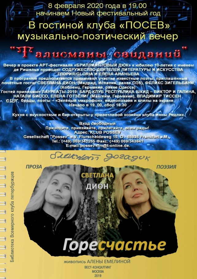 | 16/2 → По старинным рецептам (Leuven) 15/2 → Open Laboratory 2020 - 7+ (Saint-Josse) 16/2 → Пластилиновый спектакль - 4+ (Antwerpen) 16/2 → Экскурсия в музей Плантена (Antwerpen) 18/2 → Concert « Winter Fantasies » (Saint-Josse) 18/2-25/3 → La magie de l'aquarelle (Saint-Josse) 20/2-20/3 → Elena Preis & Vassily Pavlovsky (Bruxelles) 23/2 → Uitbundige Russische Dansen (Oostende) 23/2 → Поль Дельво. Человек, любивший поезда (Schaarbeek) 24-28/2 → Stage Сarnaval (Uccle) 25/2 → Крокус-каникулы в лагере Радуга (Antwerpen) 25-27/2 → Swan Lake (Mons/Liège) 26/2 → Challenges of Authoritarian Citizenship (Gent) 28/2 → Giacomo Quarenghi et Saint-Pétersbourg (Watermael-Boitsfort) 29/2 → Царевна-лягушка (Haarlem) 21/2-1/3 → Birds, by the Way / Chess. Shakhmaty / Zdravstvujte, rodniye (Ixelles) 21/2-1/3 → Le Lac des Cygnes. Het Zwanenmeer (Forest)/Antwerpen) 29/2-1/3 → Самая-самая... аватюрная комедия (Antwerpen/Den Haag) → 15/3 Alexandra Demenkova. Contretype (Saint-Gilles) → 21/3 Je danserai pour toi. Le fruit de nos entrailles (Paris)