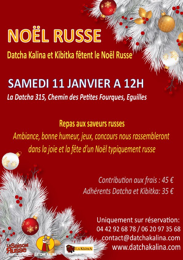 Association Slavyanochka Cette année nous ferons venir un groupe de musiciens qui chanteront des romances et des musiques traditionnelles russes. Un dîner de qualité sera servi par le restaurant de l’hôtel de Normandie. Nous organiserons également des jeux, des concours et diverses animations … En Russie, le Noël orthodoxe est célébré suivant le calendrier Julien, c’est-à-dire les 6 et 7 Janvier. Traditionnellement, on passe la veillée du 6 à l’église puis, le 7 Janvier (jour férié), la famille se réunit autour d’un repas composé de mets très variés. C’est la journée des enfants où se mêlent les rires des petits et des grands. La coutume en Russie veut qu’en étant animé et gai ce jour-là, on le restera toute l’année. Le père noël russe est représenté en costume rouge ou bleu avec sa longue barbe blanche, il se nomme « Ded Moroz » ou « Papy Gel ». Il est pratiquement toujours accompagné de sa petite fille « Snegourochka » ou « petite fille des neiges », elle aussi est vêtue de bleu ou blanc.