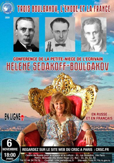 Conférence de la petite-nièce de l’écrivain Hélène Sédakoff-Boulgakov, Marseille en russe et en français La petite-nièce de l’écrivain parlera du destin des Boulgakov en France Le 6 novembre, à l’approche du 130e anniversaire de la naissance de Mikhaïl Afanassievitch Boulgakov (2021) et à l’occasion du 100e anniversaire de « L’Exode russe », le Centre de Russie pour la science et la culture à Paris organisera une rencontre en ligne avec la petite nièce de l’écrivain russe exceptionnel. Hélène (Eléna Serguéevna) Sedakoff-Bulgakova est la petite-fille d’Yvan Afanassievitch Boulgakov, musicien et compositeur, l’un des trois frères Boulgakov. Même l’existence de branches généalogiques de l’écrivain en France, hélas, n’est pas un fait connu au large public, sans parler de certaines personnes et des histoires de leur vie. La vie des jeunes frères de Mikhaïl Boulgakov — Nikolaï Afanassievitch et Yvan Afanassievitch — a longtemps été intimement liée : études à Kiev, évacuation de Crimée, pérégrination en Europe, en France … Pendant le temps difficile de l’Exode de l’armée blanche en 1920, Nikolaï et Yvan, qui ont participé à la défense de la Crimée sous le commandement du général Ya.Slaсhtchev (le prototype de Khloudov dans le roman « La fuite »), ont été évacués vers le territoire de la Turquie contemporaine en tant que membres des forces armées du sud de la Russie. Les événements tragiques de « l’Exode russe » n’ont pas contourné Nikolaï et Yvan Boulgakov. Ils ont affecté les deux frères, ainsi que de nombreux autres émigrants qui ont été emportés par la « fuite » forcée de leur patrie. L’un des sujets importants qui seront abordés concernera le sort des personnes émigrées russes qui sont arrivées en Corse en 1920 en route vers le Brésil, destination de leur futur travail forcé. Beaucoup d’entre eux sont restés en France et ont laissé une marque importante. Par ailleurs, Hélène Sedakoff-Boulgakov, souvent invitée à des conférences littéraires thématiques sur Mikhaïl Boulgakov, partagera des informations sur les publications françaises, les productions et les adaptations cinématographiques de ses œuvres, et parlera de la place que le patrimoine créatif de l’écrivain russe occupe en France. La rencontre se tiendra en live et sera disponible sur le site Web et les pages du CRSC dans les réseaux sociaux. Pour suivre la rencontre en direct, l’inscription préalable est obligatoire.
