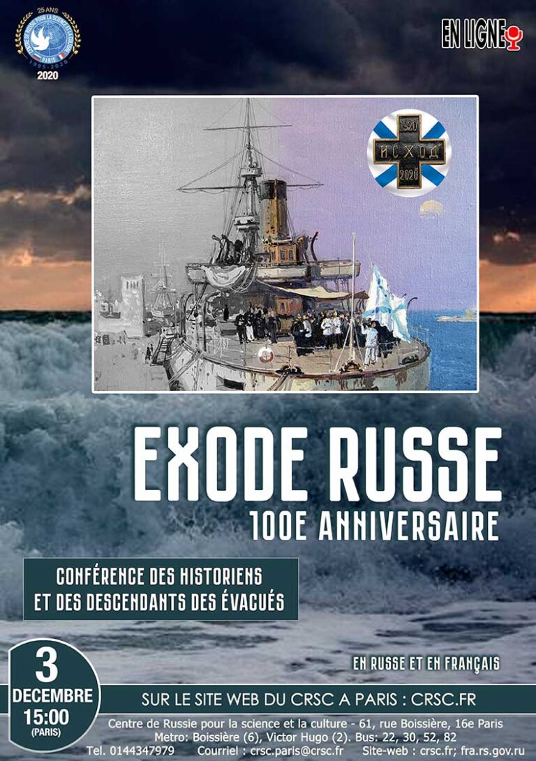 Conférence en russe et en français des historiens et des descendants d'émigrés Au sujet de la prochaine conférence historique du CRSC à Paris à l’occasion du 100e anniversaire de l’Exode de Crimée avec la participation des descendants de personnalités éminentes russes Le 3 décembre, le Centre de Russie pour la science et la culture à Paris organisera la deuxième réunion en ligne d’une série de conférences historiques dans le cadre de la Semaine de commémoration en hommage aux participants à la tragique évacuation de l’Armée russe et de la population civile de Crimée en 1920. D’anciens ressortissants de l’Empire russe, ayant tout perdu, ont fui la Crimée, où, après les événements révolutionnaires de 1917, ils ont passé une courte période de leur vie dans l’espoir de retrouver l’ancienne Russie. En 1920, ils se sont également rendus dans un pays étranger avec espoir, mais pas tous ont réussi à trouver leur place dans les nouvelles conditions. « L’Exode russe » a ouvert l’ère de l’émigration russe et a finalement achevé l’histoire de l’Empire russe. Le leitmotiv de la discussion sera la tragédie du peuple russe dispersé, les résultats sanglants de la guerre civile fratricide, le caractère inacceptable et inadmissible de tels événements dans le monde actuel. Pendant la téléconférence sera également abordé le rôle très sensible joué par les migrants forcés de Russie et leurs descendants dans le développement des cultures françaises et mondiales. Le métropolite Kirill de Stavropol et Nevinnomyssk, député de la Douma d’État de Russie Viktor Vodolatsky, directeur de la Maison des étrangers de Moscou Viktor Moskvine, directeur scientifique des Archives d’État russes d’histoire sociopolitique Andreï Sorokine, professeur, chercheur principal à l’Institut d’histoire russe de l’Académie russe des sciences Viktor Kondrachine, coprésident de l’antenne régionale de la Société d’histoire russe à Sébastopol Vadim Prokopenkov et d’autres scientifiques et experts. La participation des descendants de familles russes célèbres, de chefs militaires et de personnalités politiques est attendue : Pierre Cheremetieff, Alexey Wrangel, Dimitri de Kochko et autres. Pendant la conférence, les téléspectateurs pourront découvrir de vraies histoires de famille, poser leurs questions sur les sujets les plus intéressants liés à l’évacuation dramatique de Crimée. Pour participer à la réunion en ligne, qui se tiendra avec traduction simultanée en russe et en français, l’inscription est obligatoire sur le site web du CRSC à Paris (crsc.fr). Intervenants : VOLKOV Konstantin, MESHKOV Alexey, METROPOLITE KIRILL, VODOLATSKI Victor, GAGARINE Marie-Madeleine (Macha MERIL), CHEREMETIEFF Pierre, MOSKVINE Victor, KONDRACHINE Victor, CHEPELEV Guéorgui, DE KOCHKO Dimitri, SOROKINE Andrei, GROMOVA Anna, PROKOPENKOV Vadim, VOVK Alexei, WRANGEL Alexeï, KOTCHOUBEÏ Andrei, IASIKOFF Anne-Orain