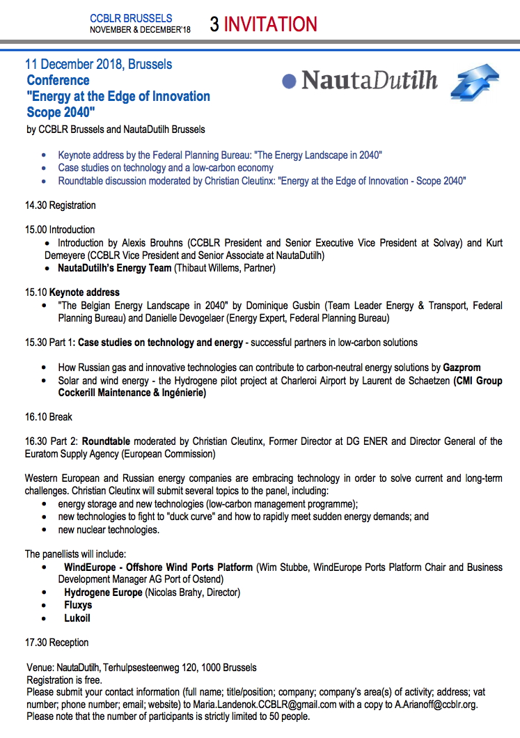 29 – 30 November 2018, Russia - Energy Sector Mission to the Russian Khanty-Mansi Autonomous Region — Yugra | Inside West Siberia. 11 December 2018, Brussels. Conference "Energy at the Edge of Innovation Scope 2040" News From Russia 4 News From Belarus 11 Culture 12 Exhibitions & External Events 13 17 October - 8 may 1919, Russia platform. CERISE lectures 22 November 2018, Belgium, Next session of the Import-Export Club: Russie, Belarus, Kazakhstan, Kirghizistan, Arménie 27 – 28 November 2018, Krasnogorsk (Moscow Region) 5th International Agricultural Dairy Forum 12 – 15 March 2019, Ufa (Russia), 29th International specialized exhibition "Agro Complex" World Expo 2025 Ekaterinburg, Russia. Changing the world : innovations and better life for future generations. Job Search 18 CCBLR Services / Staff 20 CCBLR Membership Application Form 21