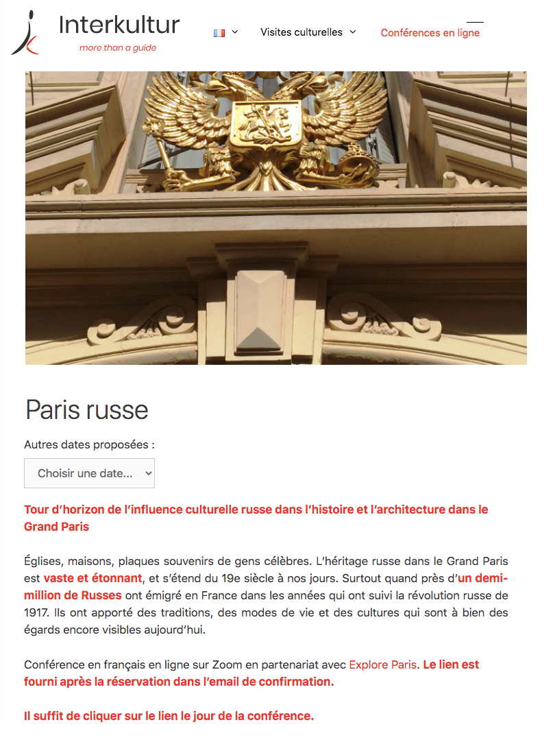 Page Internet. Zoom en-ligne - Paris russe, par le guide conférencier Thierry Heil. 2021-03-29