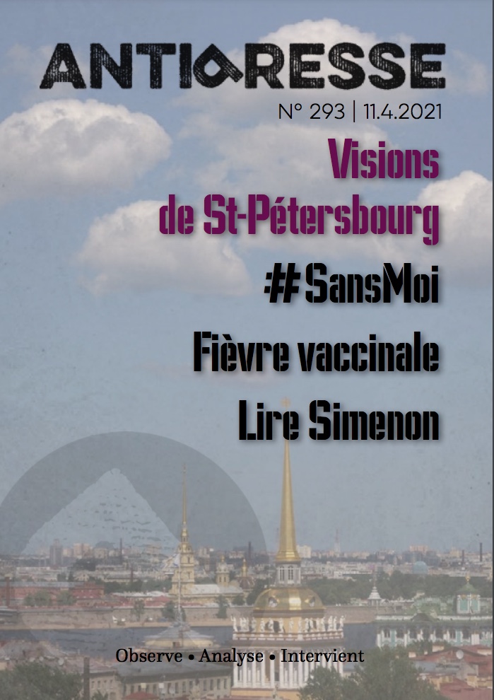 Antipresse № 293 Observe • Analyse • Intervient Extraits de contenu : LE BRUIT DU TEMPS par Slobodan Despot Nuits blanches (visions de Saint-Pétersbourg) Depuis vingt-et-un ans que je retourne en Russie, je n’avais jamais visité Saint-Pétersbourg. L’occasion ne s’était pas présentée et j’avais cru pouvoir la compenser par quelques lectures. Mais je suis comme Simenon et son compère Maigret: je ne peux pas comprendre un lieu ou une situation sans l’avoir touché de mes doigts, humé, parcouru. De préférence, en y flânant sans but plutôt qu’en trottant derrière des guides. Musée d’Europe - un alphabet oublié - la ville aux trois noms - le laboratoire de la régression totalitaire - le message de Peterhof - le monde selon Khorochilov - notes ENFUMAGES par Eric Werner Sans moi, ou la lecture comme contrecourant Face au raz-de-marée du «mainstream», à la déferlante des «Me Too» et la terreur de l’unanimité, un petit nombre de rescapés reste toujours debout et refuse d’entrer dans la danse. Pourquoi? Qu’est-ce qui les motive à résister? Qu’est-ce qui les caractérise? Voilà l’un des mystère des «lois générales du comportement humain». Les «moi aussi» contre les «rescapés» - Contrecourants - La continuité de l’êtreLectures suggérées LA POIRE D’ANGOISSE par Slobodan Despot La guerre du vaccin secoue la société russe. Alors que le président Poutine fait le minimum nécessaire et se désintéresse fondamentalement de la question, certaines villes et régions de Russie plongent tête baissée dans la frénésie vaccinale. L’on y voit même des religieux inventer le péché épidémiologiquee… Tandis que le bon peuple préfère encore se faire licencier que de se faire piquer.