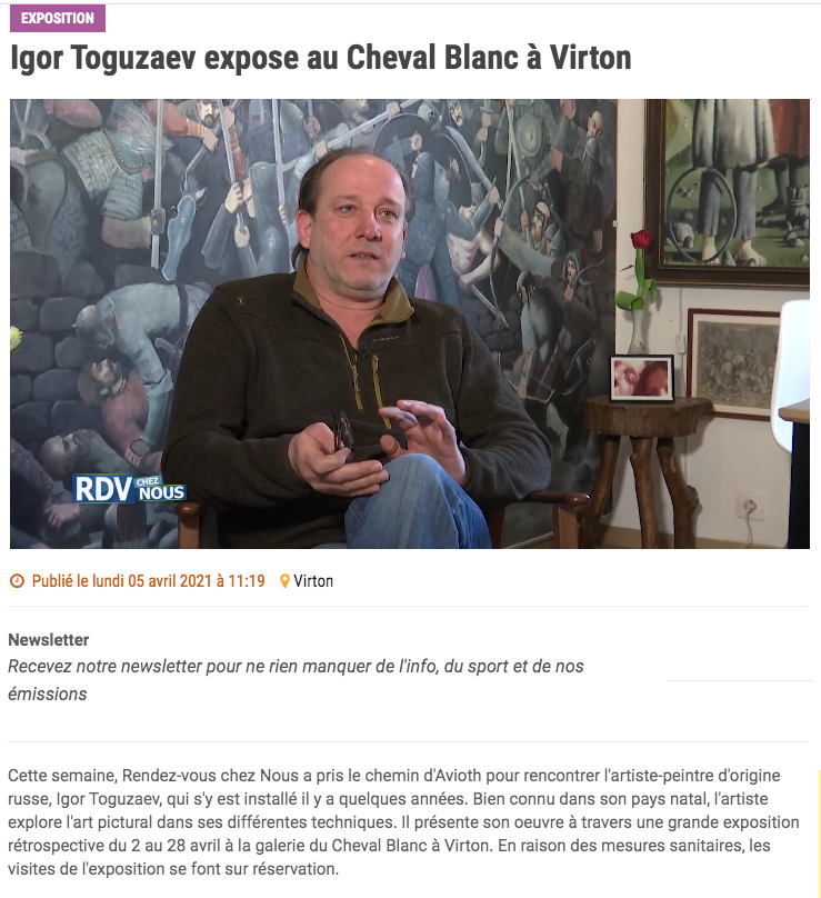 Cette semaine, Rendez-vous chez Nous a pris le chemin d'Avioth pour rencontrer l'artiste-peintre d'origine russe, Igor Toguzaev, qui s'y est installé il y a quelques années. Bien connu dans son pays natal, l'artiste explore l'art pictural dans ses différentes techniques. Il présente son oeuvre à travers une grande exposition rétrospective du 2 au 28 avril à la galerie du Cheval Blanc à Virton. En raison des mesures sanitaires, les visites de l'exposition se font sur réservation.