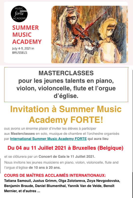 Date limite d'inscription : le 1 mai 2021 Summer Music Academy Invitation à Summer Music Academy FORTE! ous avons un énorme plaisir d’inviter les élèves à participer aux Masterclasses en solo, musique de chambre et l’orchestre organisés par International Summer Music Academy FORTE qui aura lieu Du 04 au 11 Juillet 2021 à Bruxelles (Belgique) et se clôturera par un Concert de Gala le 11 Juillet 2021. Nous invitons les jeunes musiciens en piano, violon, violoncelle, flute and l’orgue d’église de 10 ans à 20 ans. Cours de maîtres acclaimés internationaux : Tatiana Samouil, Justus Grimm, Olga Zolotareva, Zoya Nevgodovska, Benjamin Braude, Daniel Blumenthal, Yannik Van de Velde, Benoît Mernier, et d'autres ... Grâce aux professeurs mondialement connus et la situation géographique favorable, Summer Music Academy FORTE présente aux jeunes musiciens une opportunité unique de contribuer au développement de leur créativité et de leur carrière musicale en Europe et d’autres continents et aide à rencontrer des personnes avec les mêmes intérêts. Grâce aux professeurs mondialement connus et la situation géographique favorable, Summer Music Academy FORTE présente aux jeunes musiciens une opportunité unique de contribuer au développement de leur créativité et de leur carrière musicale en Europe et d’autres continents et aide à rencontrer des personnes avec les mêmes intérêts. Practical Info : Les Masterclasses en solo, musique de chambre et l’orchestre. Y compris 2 concerts publics, un concert de Gala et un concours. Maîtres de musique : Les Masterclasses sont données par des professeurs expérimentés avec le renommé mondial dans le monde de la musique.