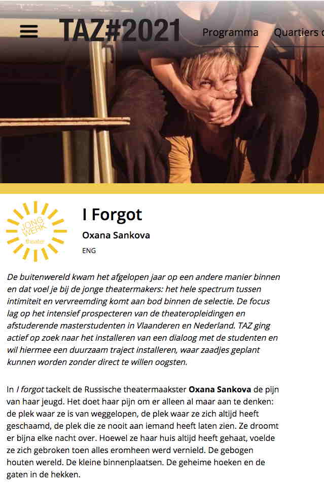 https://theateraanzee.be/programma/i-forgot https://tazetteblog.wordpress.com/2021/08/05/recensie-i-forgot-oxana-sankova-pzazz/
