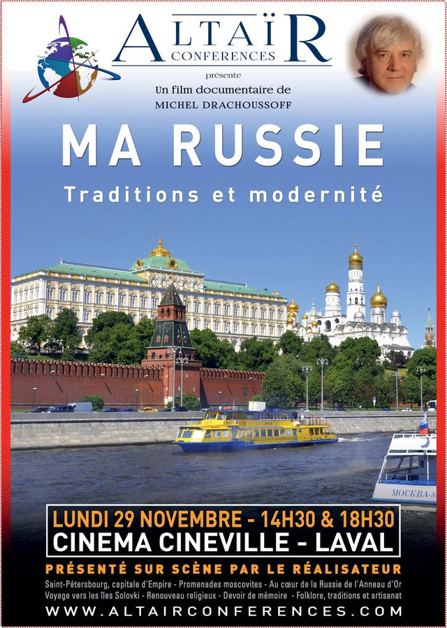 Un film documentaire de Michel Drachoussoff Début de ma tournée en Bretagne-Val de Loire dès lundi 22 novembre prochain. Si vous avez des amis passionnés de culture russe ou de voyage dans ce pays resté mystérieux à bien des égards, merci de leur passer l'information. Voici les affiches relatives à Vannes, Quimper, Château-Gontier, Laval et Tours. D'ici quelques jours, je vous passerai les affiches d'autres villes. Merci, et au plaisir de vous voir lors d'une des projections.… Je profite de l'occasion pour féliciter et remercier Eric Courtade pour la qualité de la conception graphique de cette affiche. Pour rappel, Eric a réalisé la conception graphique et la mise en page de mon livre qui connaît un beau succès.