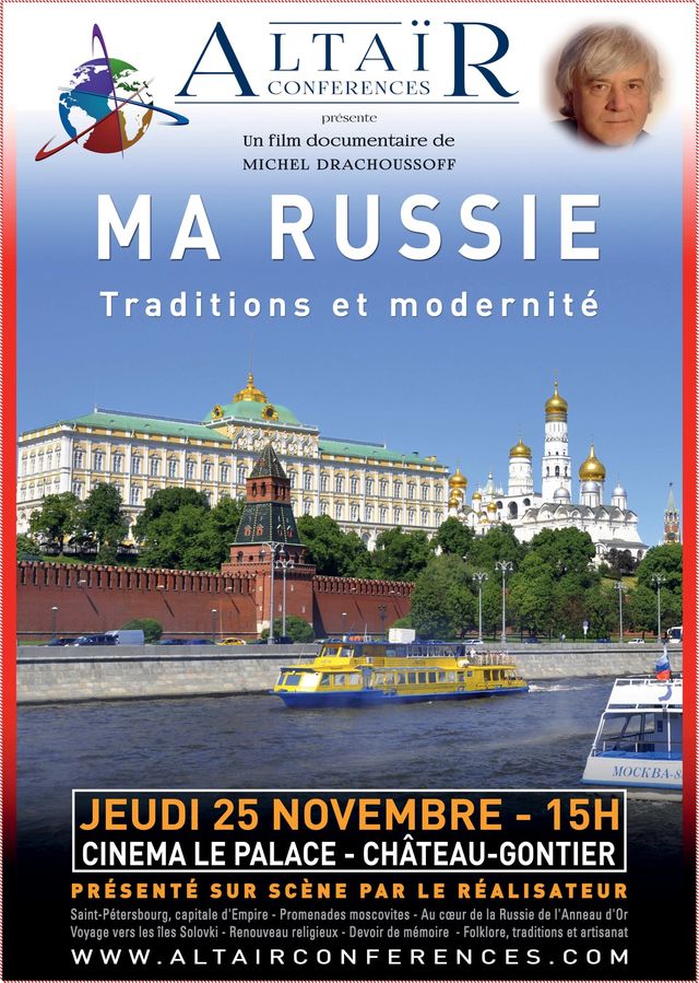 Un film documentaire de Michel Drachoussoff Début de ma tournée en Bretagne-Val de Loire dès lundi 22 novembre prochain. Si vous avez des amis passionnés de culture russe ou de voyage dans ce pays resté mystérieux à bien des égards, merci de leur passer l'information. Voici les affiches relatives à Vannes, Quimper, Château-Gontier, Laval et Tours. D'ici quelques jours, je vous passerai les affiches d'autres villes. Merci, et au plaisir de vous voir lors d'une des projections.… Je profite de l'occasion pour féliciter et remercier Eric Courtade pour la qualité de la conception graphique de cette affiche. Pour rappel, Eric a réalisé la conception graphique et la mise en page de mon livre qui connaît un beau succès.