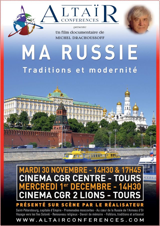 Un film documentaire de Michel Drachoussoff Début de ma tournée en Bretagne-Val de Loire dès lundi 22 novembre prochain. Si vous avez des amis passionnés de culture russe ou de voyage dans ce pays resté mystérieux à bien des égards, merci de leur passer l'information. Voici les affiches relatives à Vannes, Quimper, Château-Gontier, Laval et Tours. D'ici quelques jours, je vous passerai les affiches d'autres villes. Merci, et au plaisir de vous voir lors d'une des projections.… Je profite de l'occasion pour féliciter et remercier Eric Courtade pour la qualité de la conception graphique de cette affiche. Pour rappel, Eric a réalisé la conception graphique et la mise en page de mon livre qui connaît un beau succès.