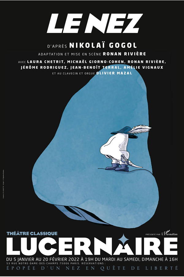 Avec : Laua Chetrit (Alexandrine) – Michael Giorno-Cohoen (Le Barbier) – Ronan RIVIÈRE (Le Nez, Le Policier) – Jerôme Rodriuez (Kovalev) – Jean-Benoît Terral (Le Médecin, Michka) – Amélie Viçgnaux (Prascovia) – Olivier Mazal : Clavecin et Orgue – Musique : Léon Bailly – Décors: Antoine Milan – Assistant Pedro Alves – Postiches : Alice Laforge – Costumes : Corinne Rossi – Lumières : Marc Augustin-Viguie