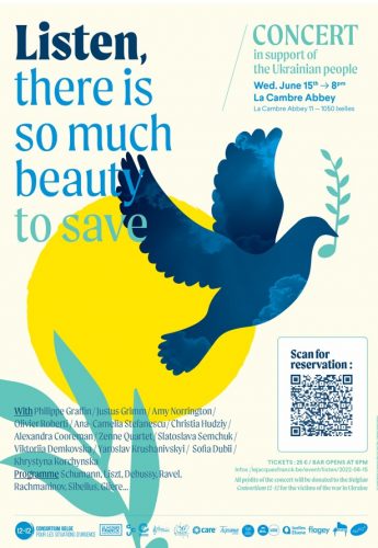 A l‘initiative d’un groupe de citoyen et de musiciens soucieux de porter haut et fort un symbole de paix et d’espérance au cœur de l’Europe, un concert de musique classique sera donné le mercredi 15 juin à 20h à l’abbaye de La Cambre, à Bruxelles. L’ensemble des bénéfices sera versé au Consortium belge 12-12 pour les victimes de la guerre en Ukraine. Des artistes unis par la musique Un programme varié sera proposé par une vingtaine de musiciens de nationalités différentes, qui se succéderont ou joueront ensemble. Parmi eux, plusieurs artistes d’origine russe et ukrainienne veulent montrer qu’il est possible de se réunir autour de la musique et qu’ensemble « Il y a tant de beauté à sauver », comme le proclame le titre de ce concert.