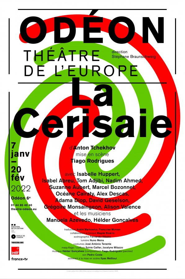 Anton Tchekhov / Tiago Rodrigues, avec Isabelle Huppert Une courte pause dans l’interminable confinement nous a permis de voir By heart et Sopro, pièces de Tiago Rodrigues. Le revoici, accompagné de la sublime Isabelle Huppert, avec La Cerisaie d’Anton Tchekhov. Dans cette ultime pièce du dramaturge russe, Lioubov Andreevna Kanevskaïa, personnage insaisissable, revient parmi les siens après qu’un amant l’a entièrement ruinée. La propriété et sa féérique cerisaie sont mises aux enchères pour cause de dettes. L’ère de la servitude abolie, l’aristocratie en décadence, c’est le marchand Lopakhine qui acquiert le domaine. Chacun va partir vers une nouvelle existence, soit taraudé par les soucis, soit gonflé d’espoir. Pour cette pièce que l’auteur souhaitait comédie et que beaucoup ont lue comme un drame, Tchekhov traite d’un temps de profondes mutations sociétales. Imperceptibles pour nombre de femmes et d’hommes ancrés dans le déni des changements mais éloquentes pour ceux à qui les chaos et tournants de l’histoire sont profitables. La Cerisaie c’est, à travers les mots d’Anton Tchekhov, nous regarder nous-même, ici et maintenant. Texte - Anton Tchekhov Traduction - André Markowicz et Françoise Morvan Mise en scène - Tiago Rodrigues Collaboration artistique - Magda Bizarro Scénographie - Fernando Ribeiro Lumière - Nuno Meira Costumes - José António Tenente Maquillage, coiffure - Sylvie Cailler, Jocelyne Milazzo Musique - Hélder Gonçalves (composition), Tiago Rodrigues (paroles) Son - Pedro Costa Assistanat à la mise en scène - Ilyas Mettioui Avec Isabelle Huppert (Lioubov), Isabel Abreu (Charlotta), Tom Adjibi (Epikhodov) Nadim Ahmed (Iasha), Suzanne Aubert (Douniacha), Marcel Bozonnet (Firs), Océane Caïraty (Varia), Alex Descas (Gaiev), Adama Diop (Lopakhine, David Geselson (“Petia” Trofimov), Grégoire Monsaingeon (Simeonov), Alison Valence (Ania) Et Manuela Azevedo, Hélder Gonçalves (musiciens) Construction décor Ateliers du Festival d’Avignon Confection costumes - Ateliers du TNP de Villeurbanne Production - Festival d’Avignon Coproduction Odéon-Théâtre de l’Europe, Théâtre National Dona Maria II, Théâtre National Populaire de Villeurbanne, Comédie de Genève, La Coursive, scène nationale de la Rochelle, Wiener Festwochen, Comédie de Clermont Ferrand, National Taichung Theater, Teatro di Napoli – Teatro Nazionale, Fondazione Campania Dei Festival – Compania Teatro Festival, Théâtre de Liège, Holland Festival, International Theater Amsterdam Soutien Fondation Calouste Gulbenkian, DC&J Création, Tax Shelter du Gouvernement Fédéral de Belgique et de Inver Tax Shelter Résidence à La FabricA du Festival d’Avignon et à l’Odéon – Théâtre de l’Europe Création en juillet 2021 dans le cadre du 75e Festival d’Avignon