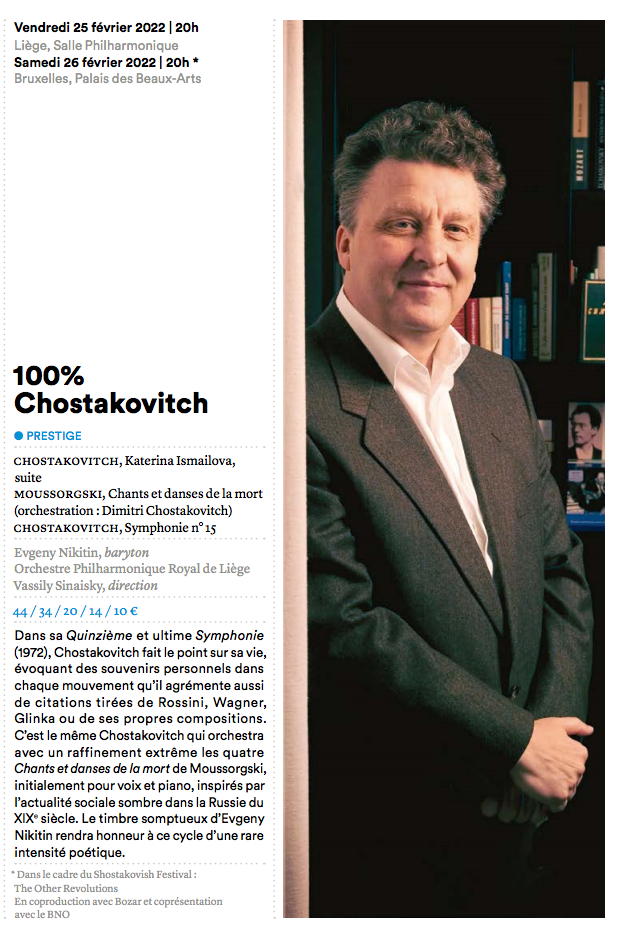 PRESTIGE : 44 / 34 / 20 / 14 / 10 € Chostakovitch, Katerina Ismailova, suite Moussorgski, Chants et danses de la mort (orchestration : Dimitri Chostakovitch) Chostakovitch, Symphonie n° 15, Evgeny Nikitin, baryton, oprl | Vassily Sinaisky, direction