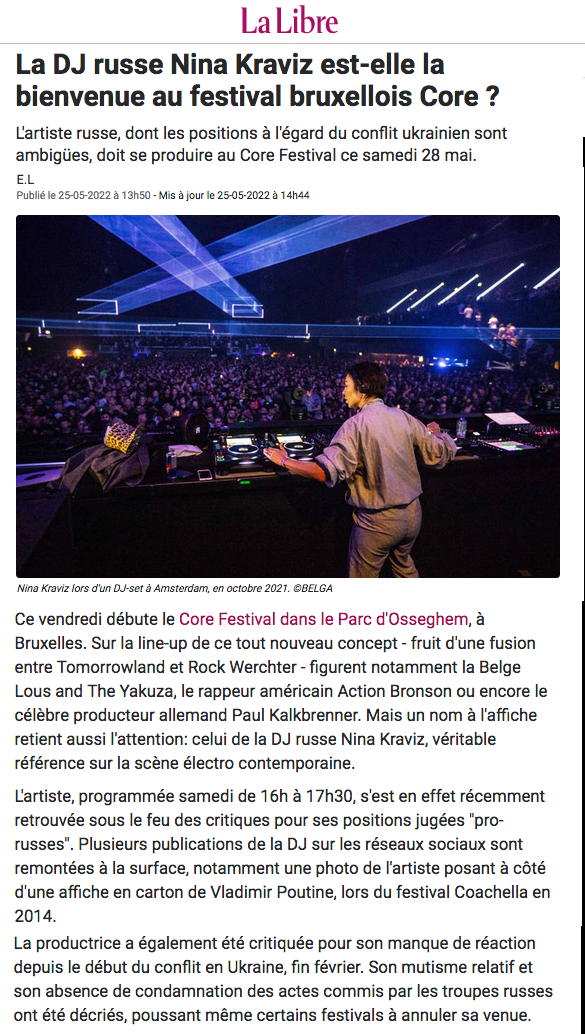 https://www.lalibre.be/culture/musique/2022/05/25/la-venue-de-la-dj-russe-nina-kraviz-dans-un-festival-bruxellois-suscite-la-controverse-FSQR4S6KQREKVGE3XMWNY6D2UQ/ https://www.moustique.be/culture/musique/2022/05/25/core-festival-la-dj-russe-nina-kraviz-sur-la-sellette-238996 https://www.lecho.be/economie-politique/belgique/bruxelles/faut-il-interdire-a-la-dj-russe-nina-kraviz-de-jouer-a-bruxelles/10391101.html