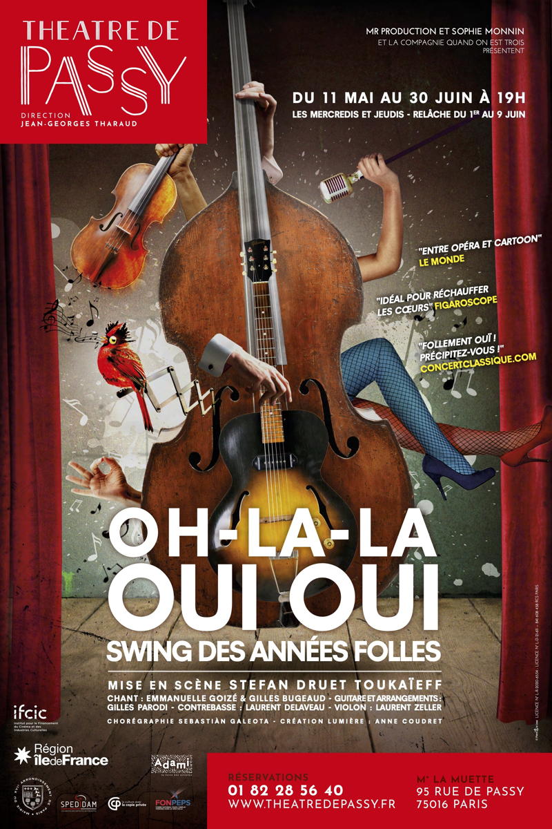 Mise en scène par Stefan Druet Toukaïeff "Pourquoi donc lorsque l'on s'aime / Toujours s'arrêter en chemin Et remettre au lendemain / Ce qu'on peut faire si bien le soir même?" OU LÀ... Un trio swing et 2 chanteurs lyriques, mis en scène par Stefan Druet Toukaïeff : ce quintette burlesque chante l'amour sous toutes ses formes grâce au répertoire iconoclaste et à double sens des années folles. C'est aussi le parcours sentimental, affolé, intéressé ou badin d'une femme aux multiples visages, un itinéraire attachant et clownesque. OU BIEN ICI ! CHANT Emmanuelle Goizé, Gilles Bugeaud CONTREBASSE Laurent Delaveau GUITARE et ARRANGEMENTS Gilles Parodi VIOLON Laurent Zeller MISE EN SCÈNE Stefan Druet Toukaïeff CHOREGRAPHIE Sebastiàn Galeota OU ENCORE LÀ !! Au plaisir de vous croiser à cette occasion, l'équipe de Quand on est Trois et MR Production