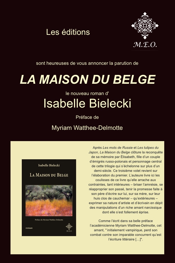 Le nouveau roman d'Isabelle Bielecki. Préface de Myriam Watthee-Delmotte Après Les mots de Russie et Les tulipes du Japon, La Maison du Belge clôture la reconquête de sa mémoire par Élisabeth, fille d’un couple d’émigrés russo-polonais et personnage central de cette trilogie qui s’échelonne sur plus d’un demi-siècle. Ce troisième volet revient sur l’élaboration du premier. L’auteure livre ici les coulisses de ce livre qu’elle arrache aux contraintes, tant intérieures – briser l’amnésie, se réapproprier son passé, tenir la promesse faite à son père d’écrire sur lui, sur sa mère, sur leur huis clos de cauchemar – qu’extérieures – exprimer sa nature d’artiste et d’écrivain en dépit des manipulations d’un riche amant narcissique dont elle s’est follement éprise.